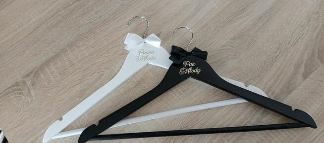 Drewniane wieszaki ślubne Panna Młoda Pan Młody Biała i czarna kokardka